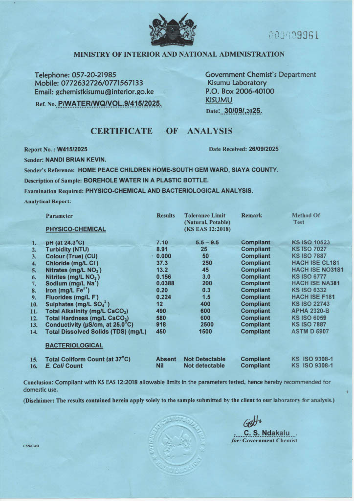 Last year, you helped us drill our own borehole, providing reliable, clean water right on site. Last month, we received confirmation that The Health Department certified our water as 100% safe for domestic use for the next two years!